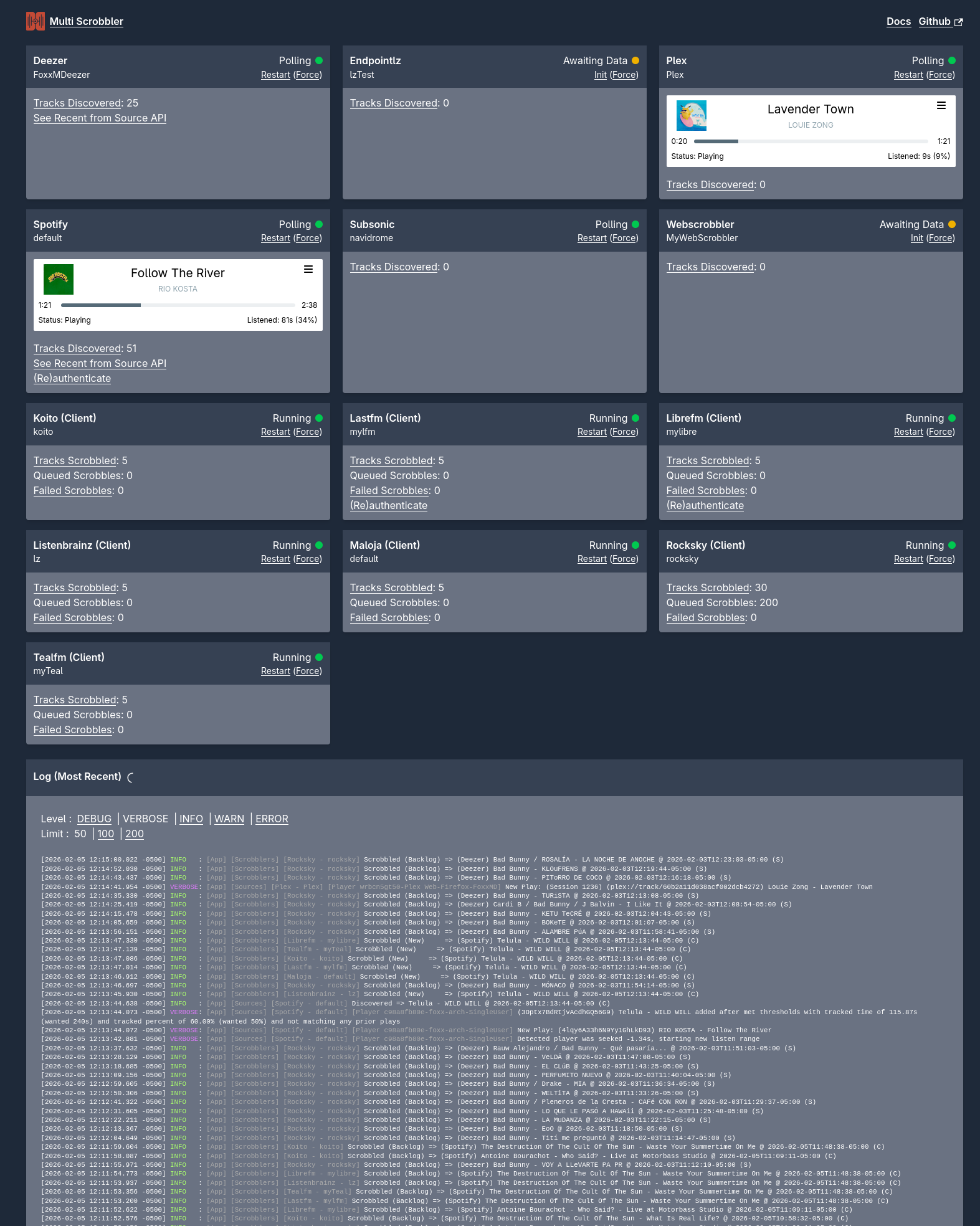 On first startup you may need to authorize Spotify and/or Last.fm by visiting the callback URL (which can also be accessed from the status page). Visit the status page above to find the applicable link to trigger this.